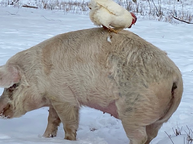 Beatrice took her last ride in a car today. She arrived here as a little pig, scared and confused. She joined Gertie in the kitchen: a duo of potbellies who watched Steve’s every epicurean move. She sashayed through the garden to join schoolchildren as they laughed and lunched on brown-bagged deliciousness. She rooted and ran, lounged in sunny patches of grass, and accepted treats whenever they were available—including as much of a box of Christmas Whitman’s Sampler as she could get before she was found out. A box of Little Debbie Strawberry Crème Cake Rolls made this morning’s journey a little less stressful and her arthritic hooves bearable. The veterinarian and students at Ohio State University Farm Animal Services in Marysville were kind, compassionate, and mercifully quick.