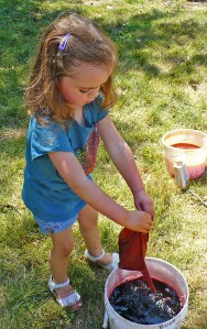 Today was quite literally of a different color. Many colors. A major tie-dye event produced a gallery of hats, shirts, cloths and even a few onesies that are now drying on tree branches and chairs at the neighboring Seitz farmhouse. A few hands were dyed in the process, as pictured above.