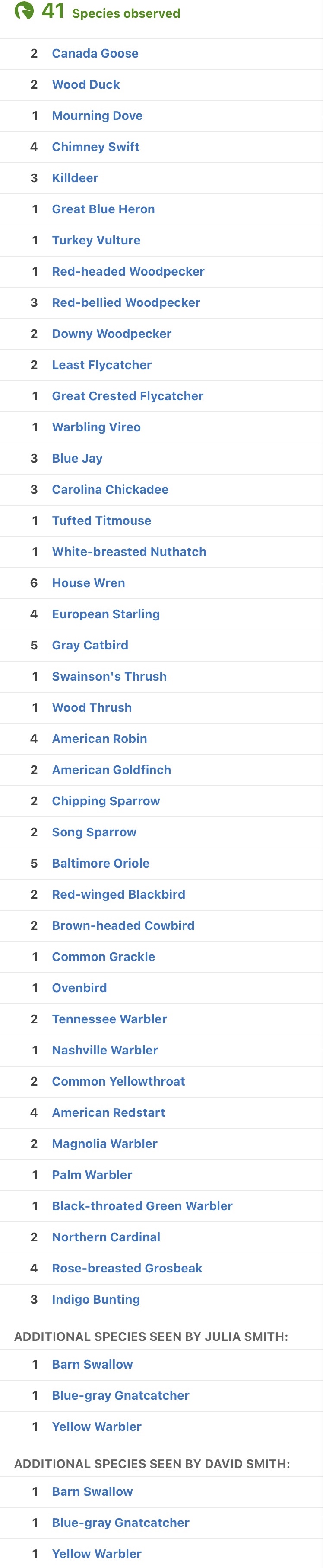 Thanks to Deb and David, this year’s Spring bird hike checklist is whole lot longer than those of past years. They looked at their previous records and chose the 2021 date. This morning was clear, floodwaters from earlier in the week had shrunk to a couple of vernal pools, and 14 birders walked the trails to record 44 species. Most of these birds are just passing through, but not before Deb could take their picture.