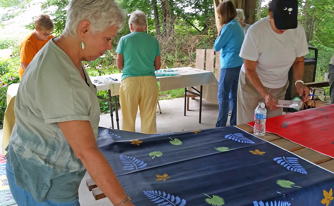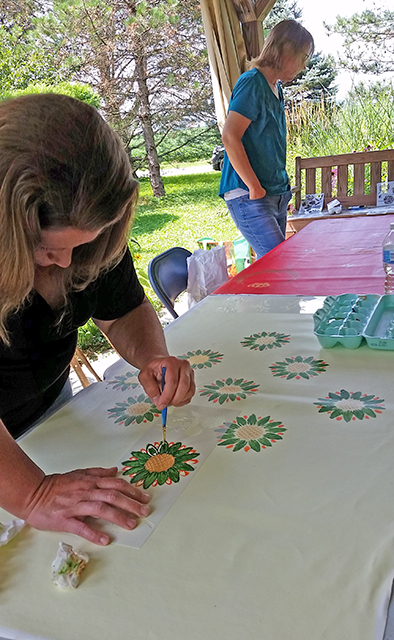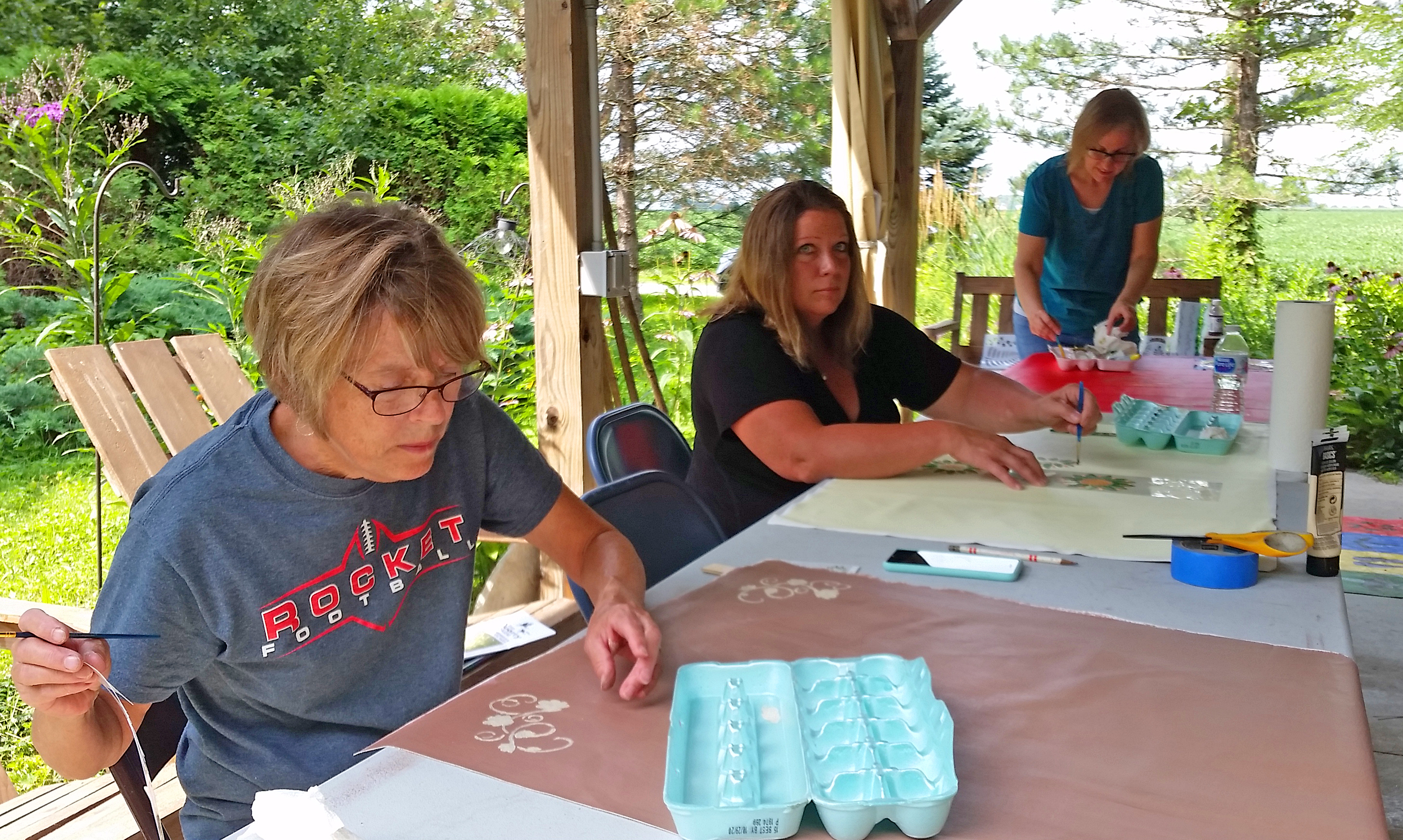 Saturday, July 31, 2021 was gorgeous: light clouds, a breeze to move them slowly across the sky, and cooler, drier temperatures. If the scheduled “Create a Floor Cloth for Your ‘Cabin'” workshop had happened earlier in the week, the acrylic paint applied by 10 textile artists to rug-worthy canvas would have puddled in the humidity. As it was, it didn’t. And just look at the participants and their work in action in the Seitz Family Pavilion.