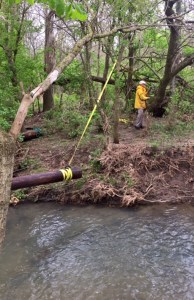 I was worried about the thunderstorms flooding the creek, and losing (the poles). As it turned out, the rain we had was necessary for me to move them to the bridge site. I worked pretty hard with the pry bar on the close one. About an hour to move it 50 meters or so. The creek was too shallow at the rapids. But for the far one, even after the rain and the creek rose 4 inches or so, it still took 2 hours of back work to get it to the bridge site. And just getting it from the bank into the creek was a challenge. Pry bar and blocks were enough, but barely.