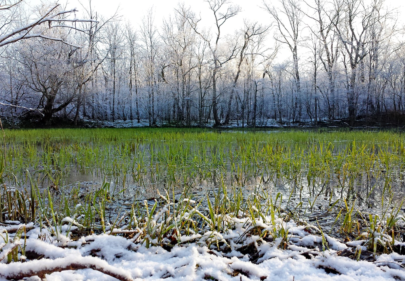 In the cold shadows of the nature preserve, the colors are still blue, gray and purple. I cross the footbridge, going where a raccoon has recently come. Blue flag shoots and water grasses rise from wetlands, brilliant green contrasts to the white that coats the trees on the high bank and the land bridge between the old stone quarry and Cranberry Run. Thanks to Paul Nusbaum, the land bridge is clear of bush honeysuckle. This will provide a living lab for school groups to discover the differences between wetlands and running streams.