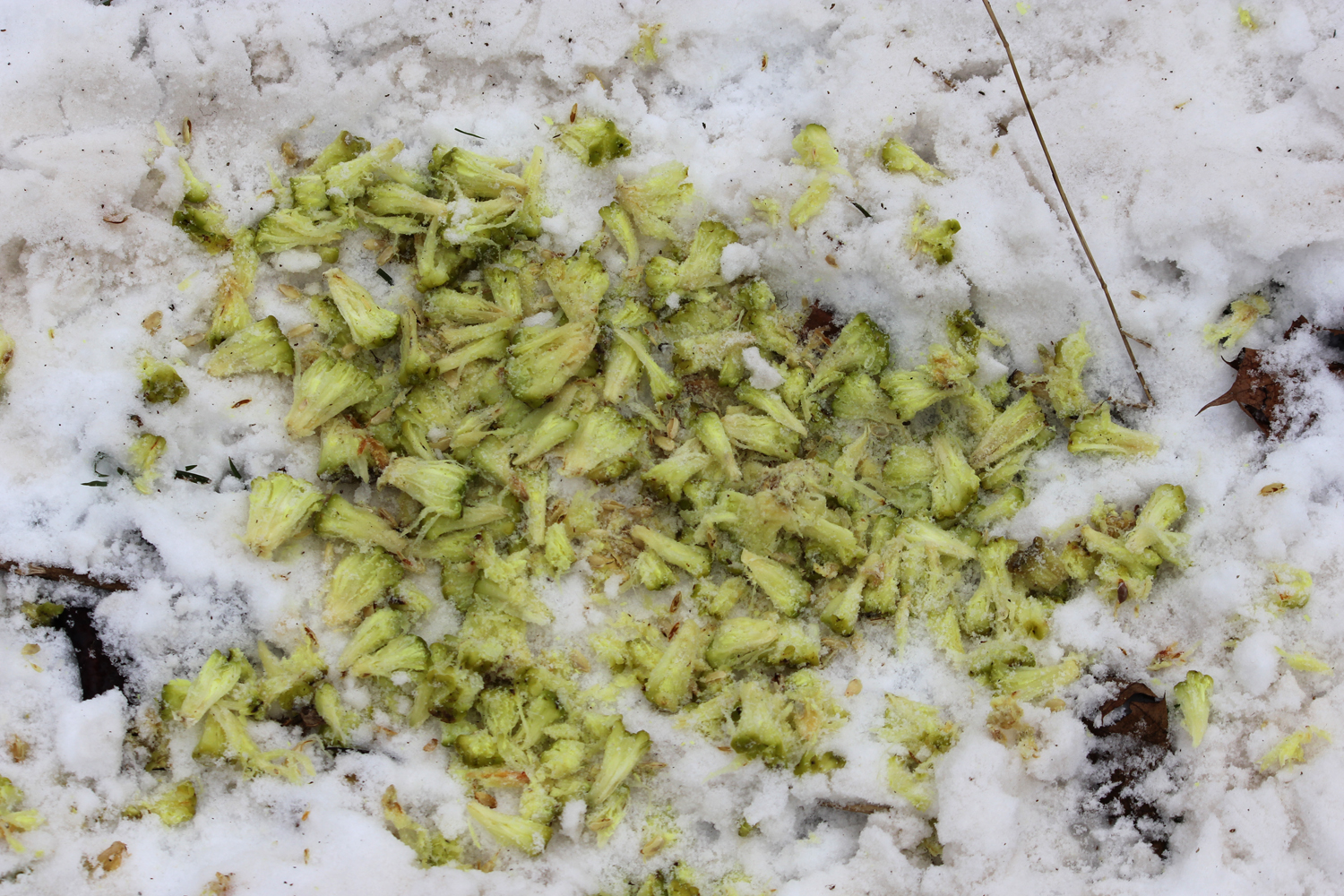 his good health soon became apparent. Scattered here and there were the remnants of osage oranges, the seed fruit of osage trees. The osage tree (Maclura pomifera), also known as the hedge or hedge-apple tree, is one of the most commonly planted trees in the United States and is used as a field hedge, wind break and to stabilize soils. Unlike apples, pears or cherries, the squirrels tear the tree’s green and yellow fruit apart to get at the seeds, not the flesh. Remnants of their feasts are scattered in oval patches here and there along the stream and back in the woods.