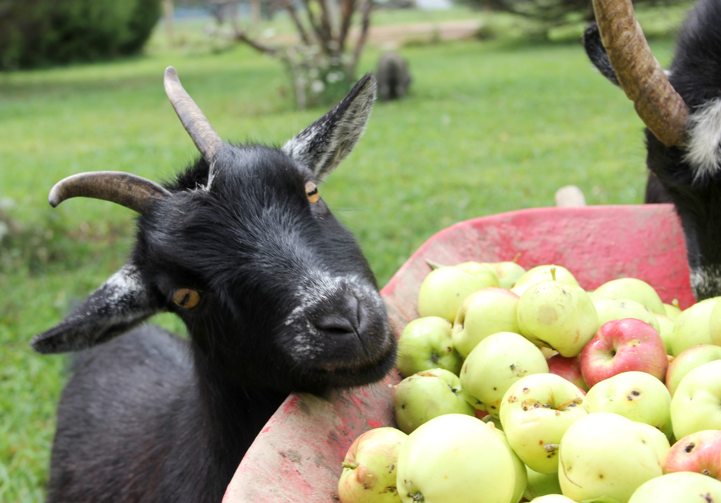 Mister Bill, a recently arrived Boer goat, was the first to discover the largesse. He set to with a will, scattering bits of apple and not-so-bits of apple in a wide arc before him. The geese and the ducks discovered the bits, which alerted the chickens and the turkeys, and they tucked in. The pygmy goats followed the Ahmeds and Kennedy to the feast, where they stood on their hind legs, front feet braced on the edge of the barrow, and bobbed for apples. The three pot-bellied pigs rolled up next (three hours later, you could have almost literally rolled them away). Finally, the two Nigerian dwarf goats and the miniature donkey caught wind of the event and made their way over. It wasn’t long before the wheelbarrow was on its side, the apples spilled across the ground, allowing everybody easy access and laying waste to the old expression, “Don’t upset the apple cart.” All in all, a most wonderful day.
