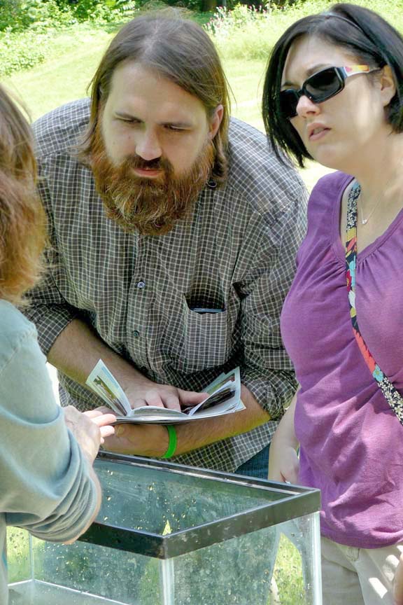 To be honest, this is the kind of presentation we like best. While a classroom setting provides the chance to really get in depth about some very important issues, it frequently lacks spontaneity. That’s never a problem when we set up in public and have people from all walks of life wander up and ask us what we’re doing there. And while we love the kids, the adults who have never seen a dragonfly nymph, never held a hellgrammite…well, they’re our favorites. Most people never completely lose their childhood curiosity and when it’s piqued, the child they were comes instantly to the fore. We were lucky enough to witness several such transformations as parents found themselves just as fascinated as their children.