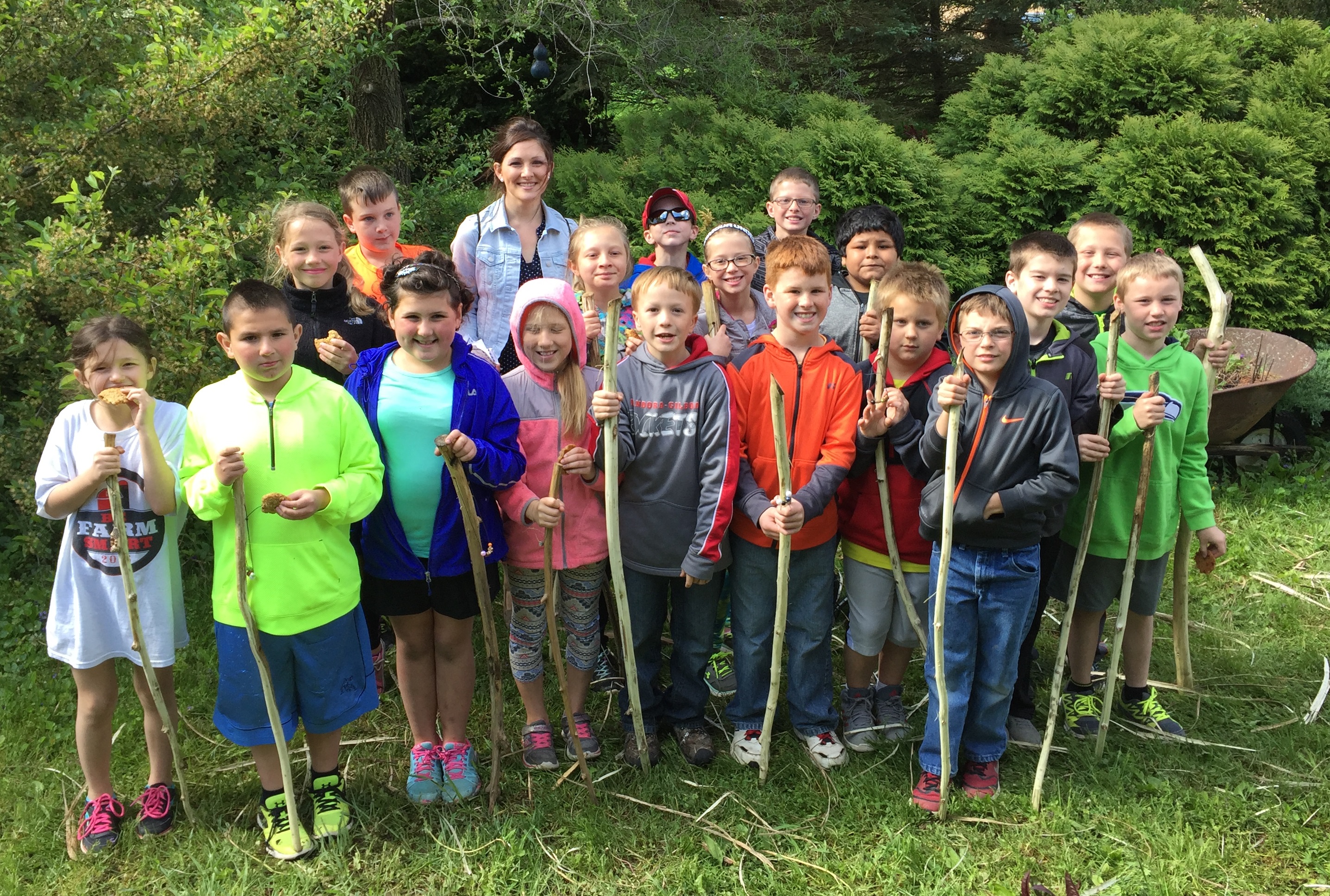 I lost the race. Anyone driving by saw two humans trimming honeysuckle trunks of branches and stems, all soaked and getting wetter by the moment. The geese weren’t bothered, but pigs, goats and donkeys watched the proceedings from under dry roofs. By 9:00 p.m., it was dark and we had 45 honeysuckle stems ready to become hiking sticks on Friday morning at the hands of the Pandora-Gilboa Elementary School’s Third Grade as taught by Mrs. Arthur and Mrs. Henry.