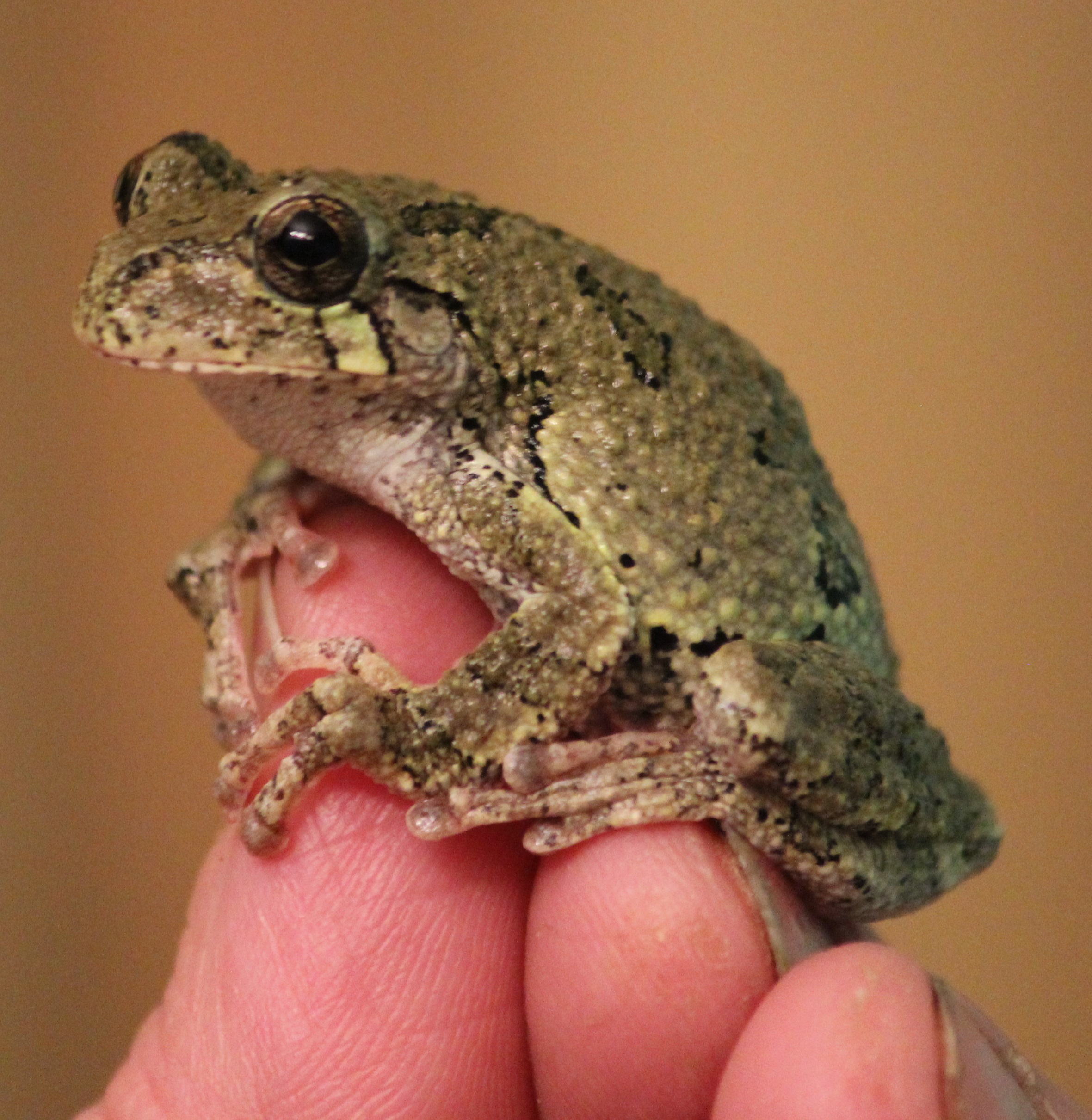 Gray tree frog, its sticky toes keeping it five feet above the ground
