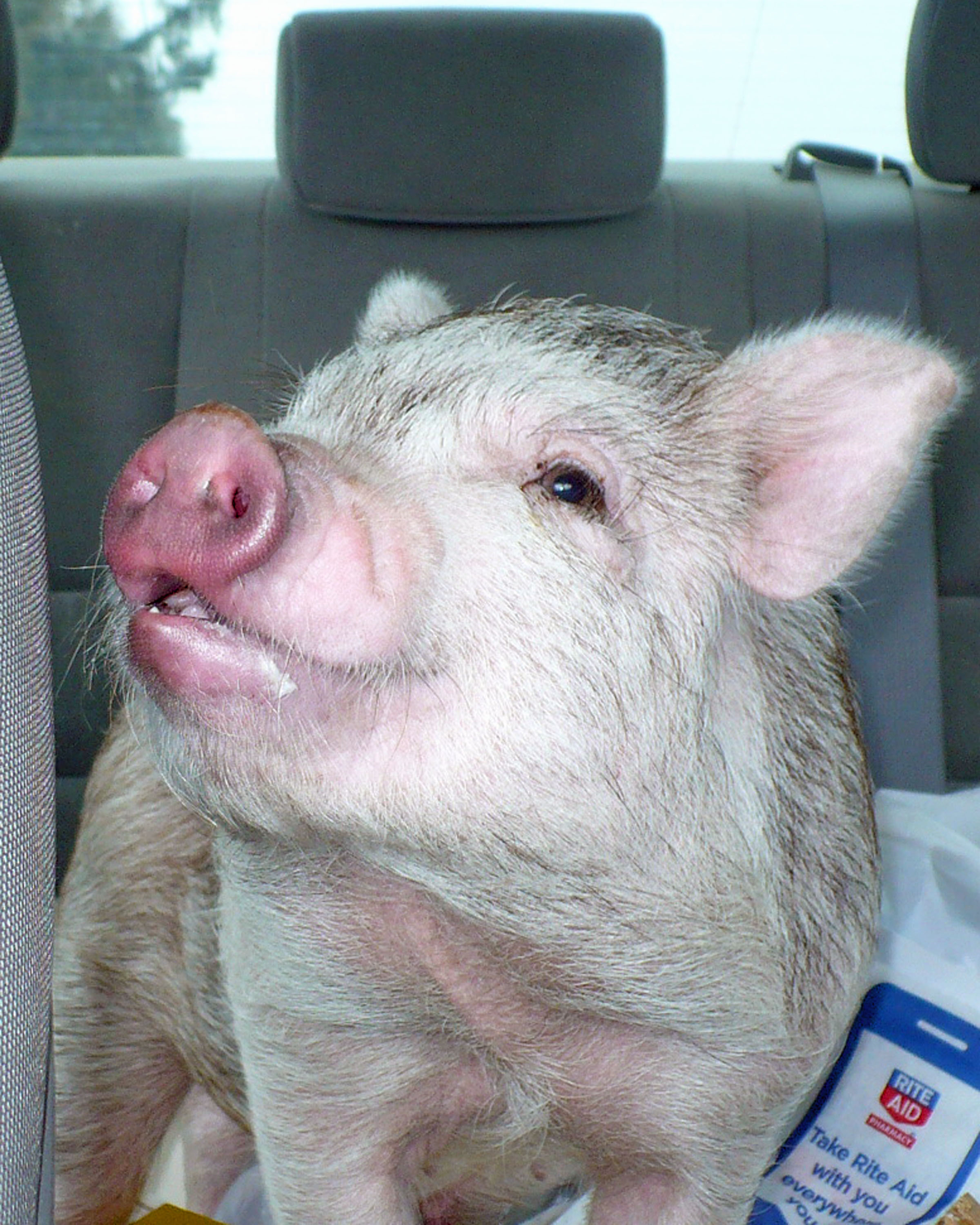 Stepping out of the car, I could hear him, the pig. He was quietly grunting, standing at the gate of a small outside kennel; behind him, a thick blanket that had served as his bed for the night. He trotted out, allowed me to scoop him up and we settled into the car for the drive back.