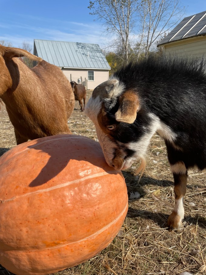 The water pans and buckets could still be filled by the outdoor hose two weeks ago. Yesterday, we woke to an inch of snow and a wagon full of frozen Hilty Farm pumpkins. Dave and Jane brought their juicy orange produce last week to rave donkey and pig reviews.