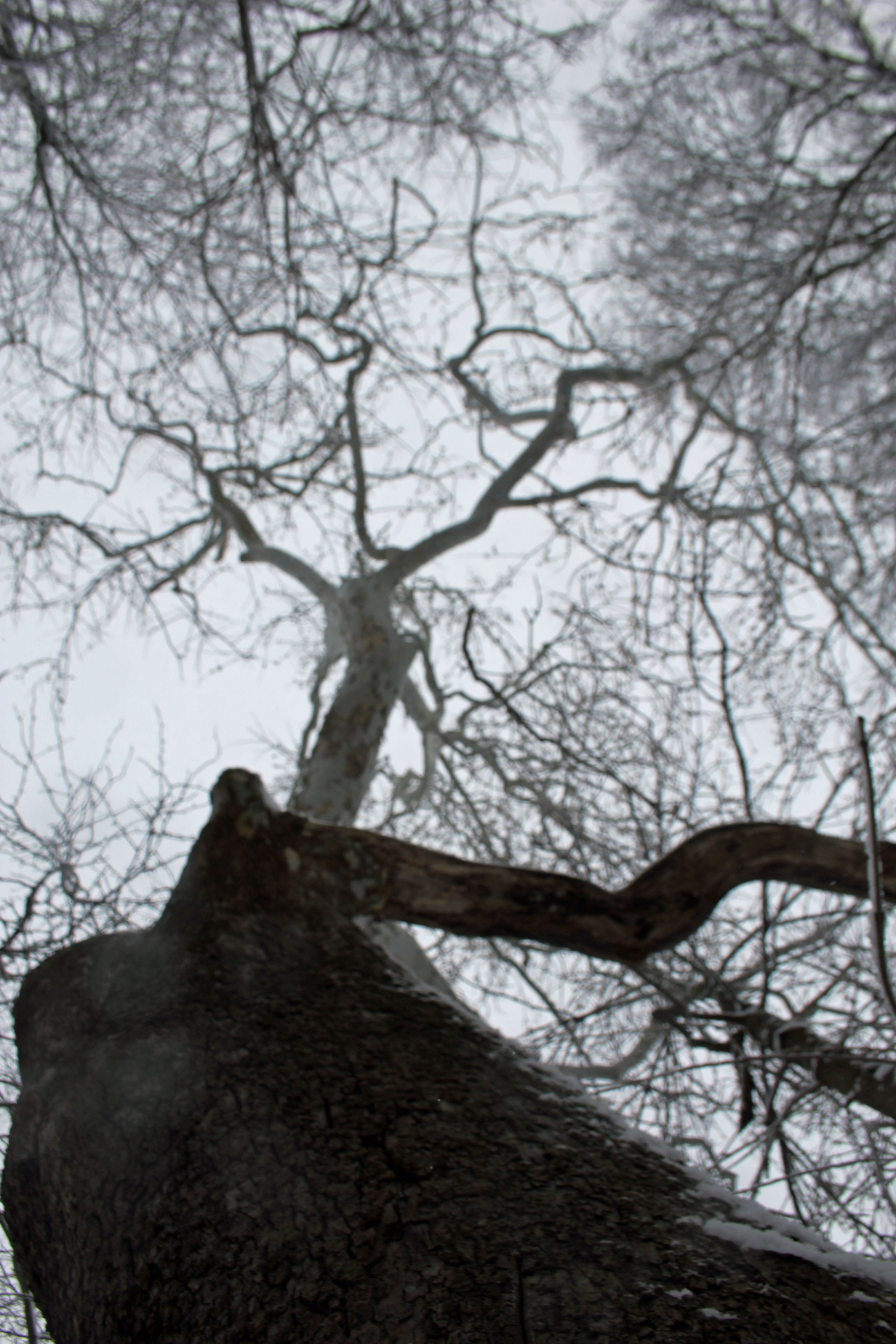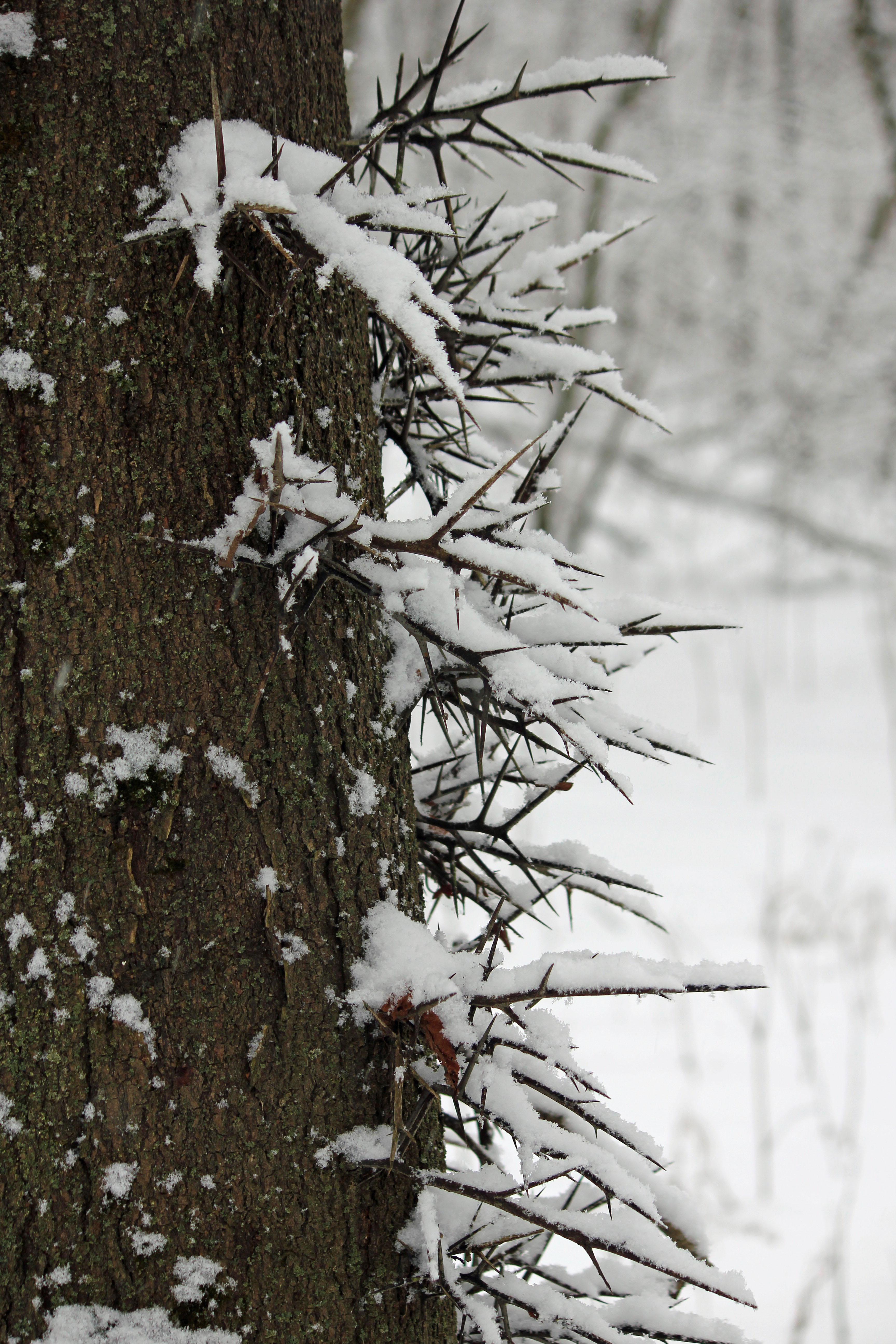 honey locustTree houseThe big back field was as quiet as the quarry and we passed through without seeing much of anything. Rounding back, we took to the path that leads down into what some locals refer to as Coburn’s Bottom. We saw a downy woodpecker or two and signs of them in some still-standing dead trees. The thorns on the honey locust trees (Gleditsia triacanthos) were softened with snow, though you’d sooner want to kiss a porcupine than hug a honey locust; the wild ones, anyway.