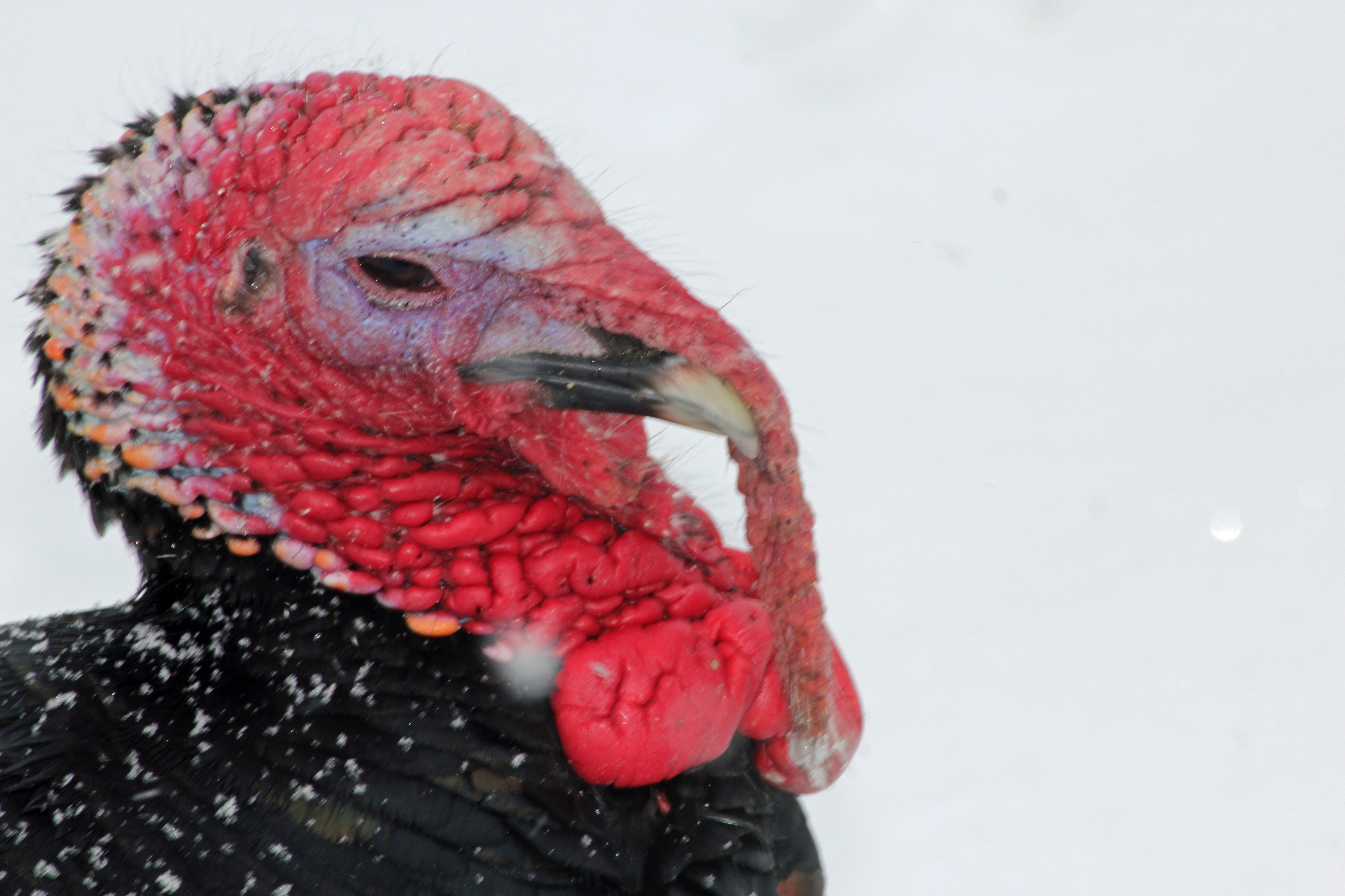 InygoNot this turkey. This is Inigo, one of the domestic bronze turkeys who live here in the residential neighborhood of The Quarry Farm. And not the turkeys pictured first. Well, probably not them, at any rate. It could be, I suppose; they’re representative of the wild turkeys that live here, but probably not, as that photograph’s at least two years old, possibly four. While turkeys in the wild are known to live to the ripe old age of 14 years, the average lifespan is only three. So, possible, but not probable.
