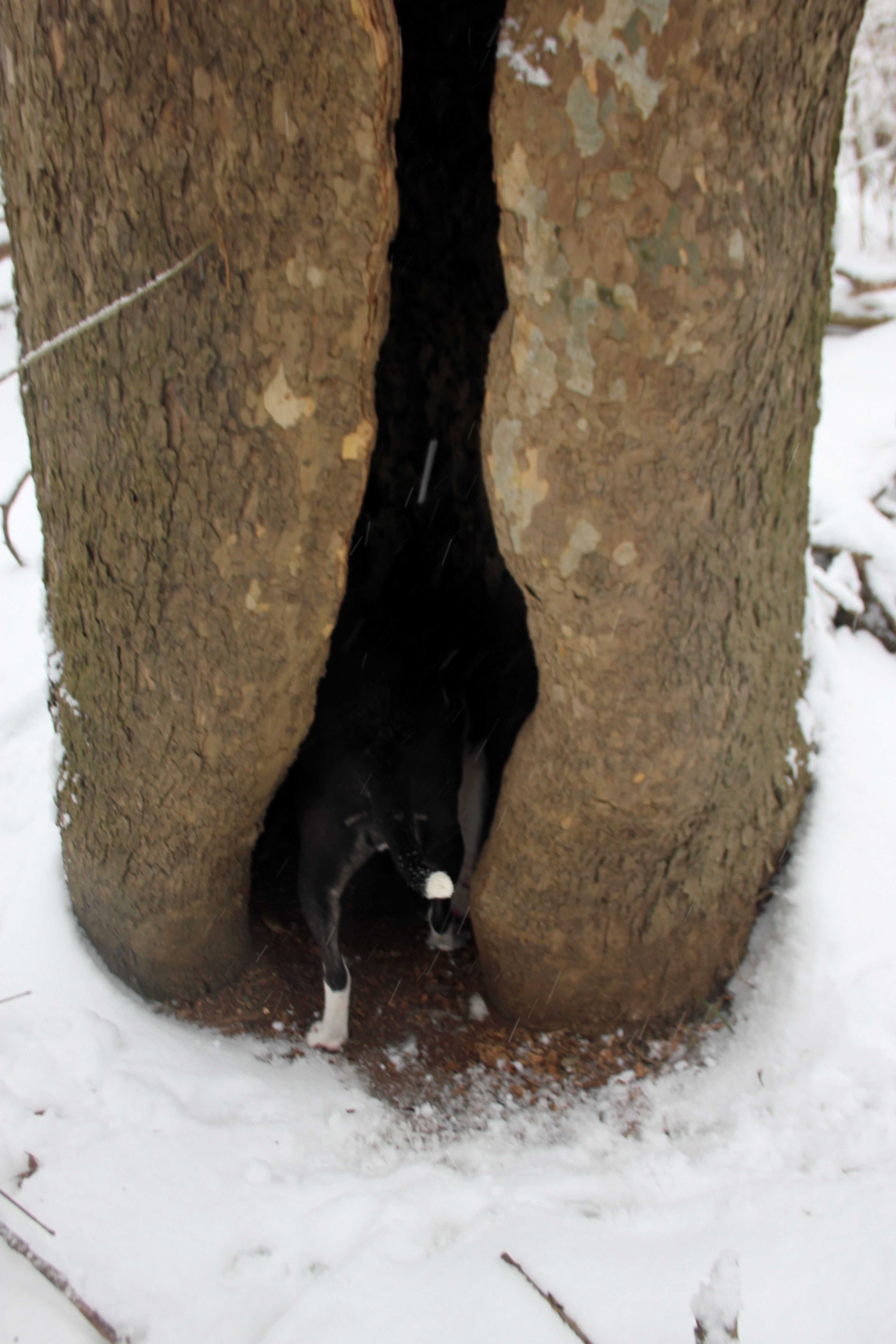 lollly in sycamoreAs for Old Man Sycamore, he’s a good four and a half feet in diameter and fifty feet high. That he’s had to work to get to sunlight is apparent. His trunk has a great bit of a bow to it where he worked his way past a rock, another tree that has long since passed or some other unknown obstacle, and his trunk bears a wide rent in the southern side that opens out into a wide cavity. Lolly just couldn’t keep her nose out of it…then her shoulders. Finally, all but her tail was snug inside.