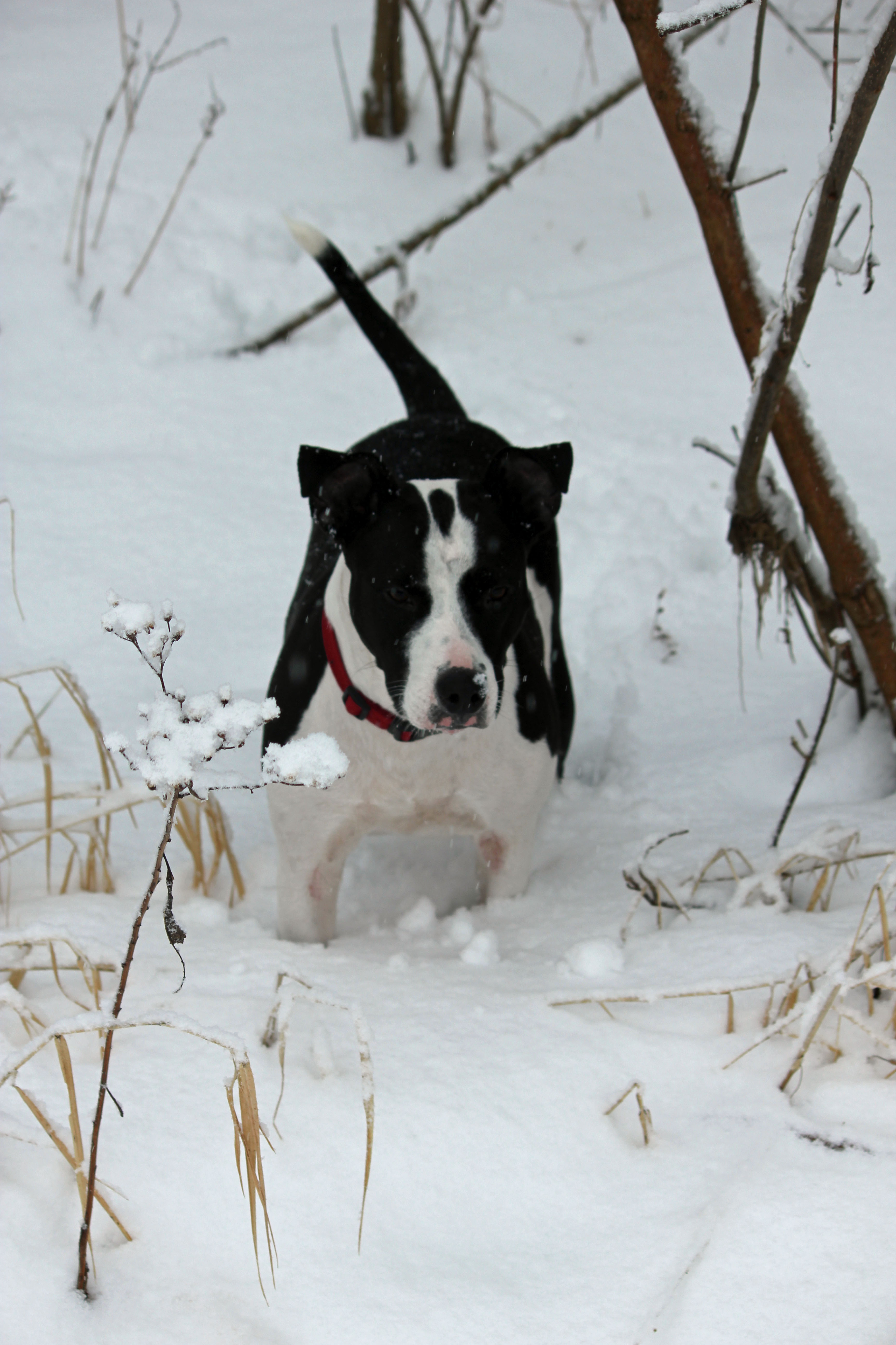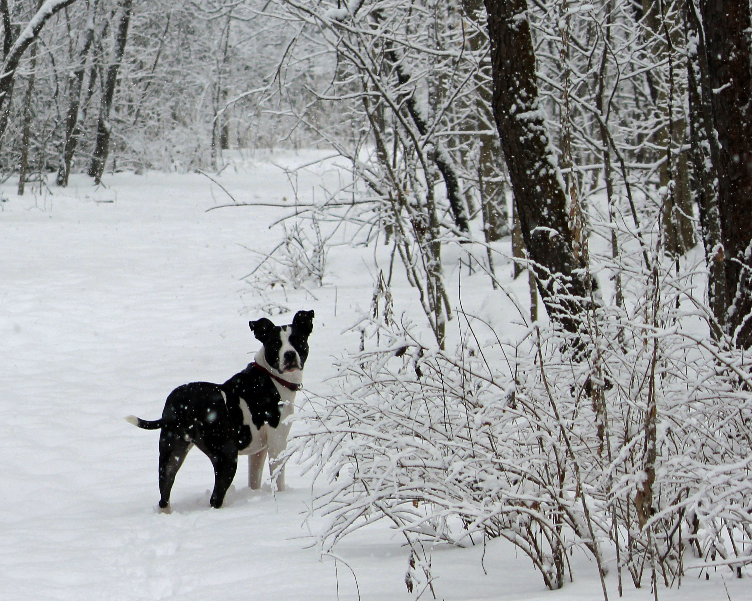 lollyMonday morning’s walk was very much like Sunday’s, though there weren’t as many tracks readily visible as the day before. The new snow had covered the old and there weren’t nearly enough intrepid explorers out and about before Lolly and I got there. We did see some eastern cottontail rabbit tracks and what we assume are fox tracks; at least, that is how they appear to us. Lolly almost first thing scared up an eastern fox squirrel; scared it right up a series of consecutively larger trees, in fact, until it settled in a big, old sycamore that sits just up and off the path.  Lolly must carry herself with a certain amount of menace, because that squirrel left the better part of its hedge-apple breakfast behind. If that squirrel only knew, it would have blown a raspberry and kept right on breaking its fast. Off we went, then, along the path some more and across the bridge and skirting the edge of the quarry, covered in a blanket of white with hardly a mark on it. Just the tracks of that rabbit I mentioned earlier. We could hear the occasional bird, but they were keeping their heads down; down and tucked under a wing, most likely, out of the snow.