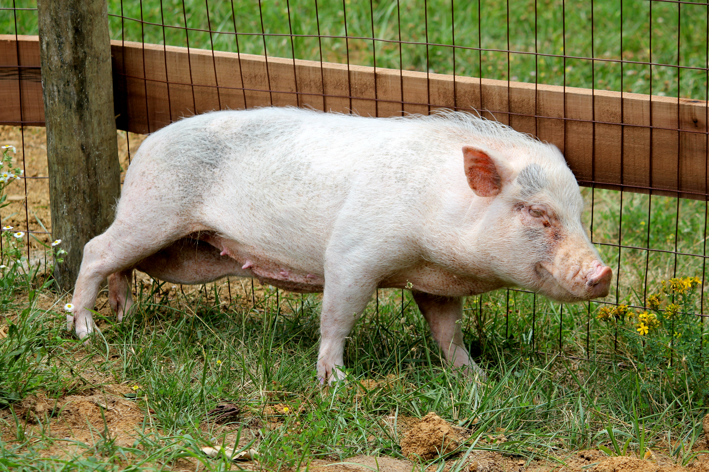 This morning, after almost nine months on The Quarry Farm, one of the sanctuary’s potbellied pigs decided to expand his territory, see just what exactly makes the other side of the green door such a big deal. It took some coaxing, about an hour of Anne’s time, three apples, a banana and a handful or two of peanuts to get him all the way into the house, but, eventually, Alphonse took the plunge. Bob Barker, his father (at least, we’re pretty sure Bob’s his father; their similarities in appearance are uncanny), watched him slowly make his way in, while Beatrice (aka Little Pig) peered through the slats in her pen at all the goings-on.