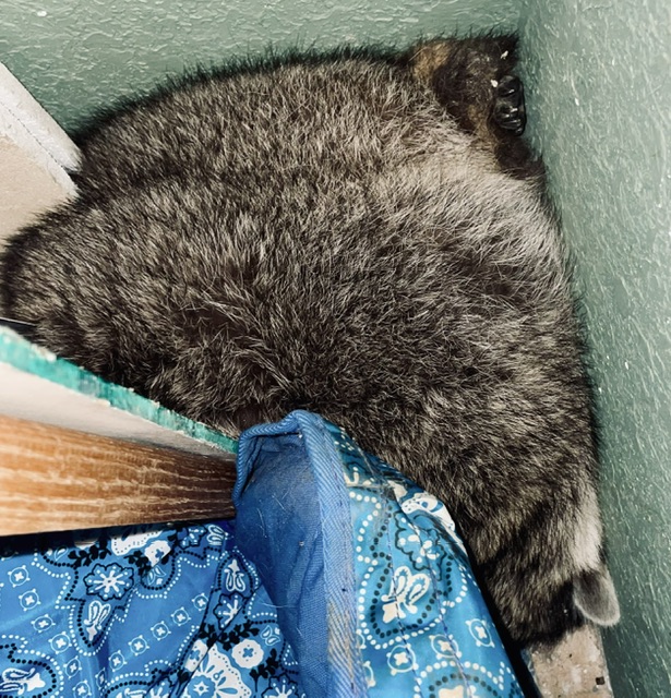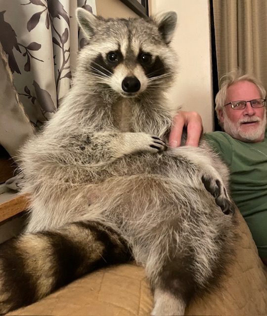 Last spring, we were asked if we were in a position to care for an 8-year-old male raccoon named Elvis. He had quite a backstory. Long-story-short, the raccoon came here in a cage. His mother was shot and killed before she could teach him how to be wild and free. He grew up in a house, and indoors is what he has always known. While a long-ago head injury and neutering tempered the more destructive nature of his kind, he still had a full set of teeth and was absolutely terrified. His diet had to be altered as well, from a reliance on people-food to fruits, veggies, protein bites and absolutely no more potato chips. It took several weeks of coaxing and a name change before Elvis became Emerson, king of the tallest bookcase, keeper of squeaky toys (unless Quinn the Fox steals them), and puller of earlobes. Thankfully, he was litterbox-trained when he arrived and never misses.