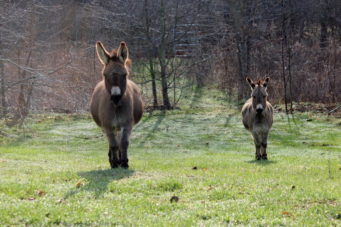 Through human eyes and sensibilities, it seems that Buddy’s warm brown eyes are brighter and five years lifted from his gait in a few hours’ time. The goats are watching them both to see which donkey will figure out how to open the hay barn doors now that the salad bar next door is off the menu.